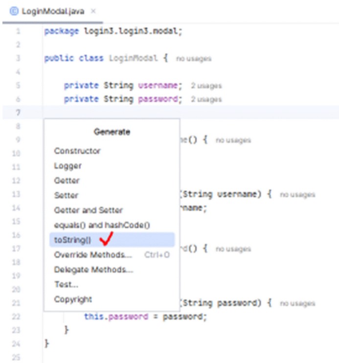 önce değişkenleri oluşturup getter ve setter ları ve sonda da toString() işlemlerini uyguluyoruz.